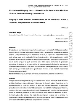 En este trabajo se analiza el camino que ha tomado Uruguay a partir del año 2005 para diversificar su matriz eléctrica y hacer frente a las diferentes crisis y tensiones que estresaban su sistema eléctrico. La dependencia del precio internacional del crudo, la exposición a estacionalidades de corto y largo plazo en la producción hídrica, la desinversión y falta de participación estatal anteriores al 2005 llevaron al planteo de una política de expansión a corto, mediano y largo plazo con la cual el Uruguay se pudo posicionar como líder regional en fuentes de generación alternativas. Analizamos en el marco teórico de los sistemas socio-técnicos las alianzas que posibilitaron este desarrollo y analizamos las controversias que se generaron en torno al precio de la energía y al rol del estado como garante de la inversión privada mediante mecanismos financieros de compensación. This paper analyzes the path that Uruguay has taken since 2005 to diversify its electricity matrix and face the different crises and tensions that stressed its electricity system. Dependence on the international price of crude oil, exposure to short and long-term seasonality in hydropower production, disinvestment and lack of state participation prior to 2005 led to the proposal of a short, medium and long-term expansion policy with which Uruguay was able to position itself as a regional leader in alternative generation sources. We analyze in the theoretical framework of socio-technical systems the alliances that made this development possible and we analyze the controversies that were generated around the price of energy and the role of the state as guarantor of private investment through financial compensation mechanisms.